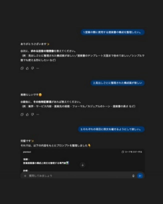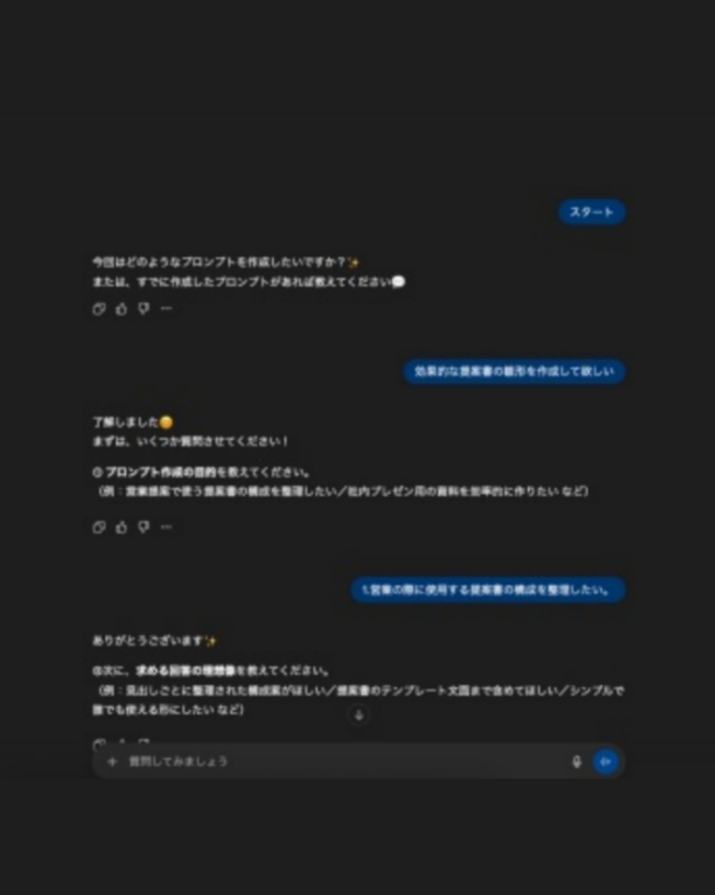 GPTs(ジーピーティーズ)は、OpenAI が提供する ChatGPT を自分の目的に合わせてカスタマイズできる仕組みです。一般的には「カスタムGPT」と呼ばれ、特にビジネスシーンでの活用が注目されています。用途に応じて柔軟に設計できる点が特徴です。専門的な知識がなくても使いこなせる設計になっており、例えば「提案資料をチェックするAIをつくりたい」と入力すれば、GPTsが目的や確認したい項目を順番にヒアリングしながら、その用途に特化したアシスタントを一緒に構築してくれます。